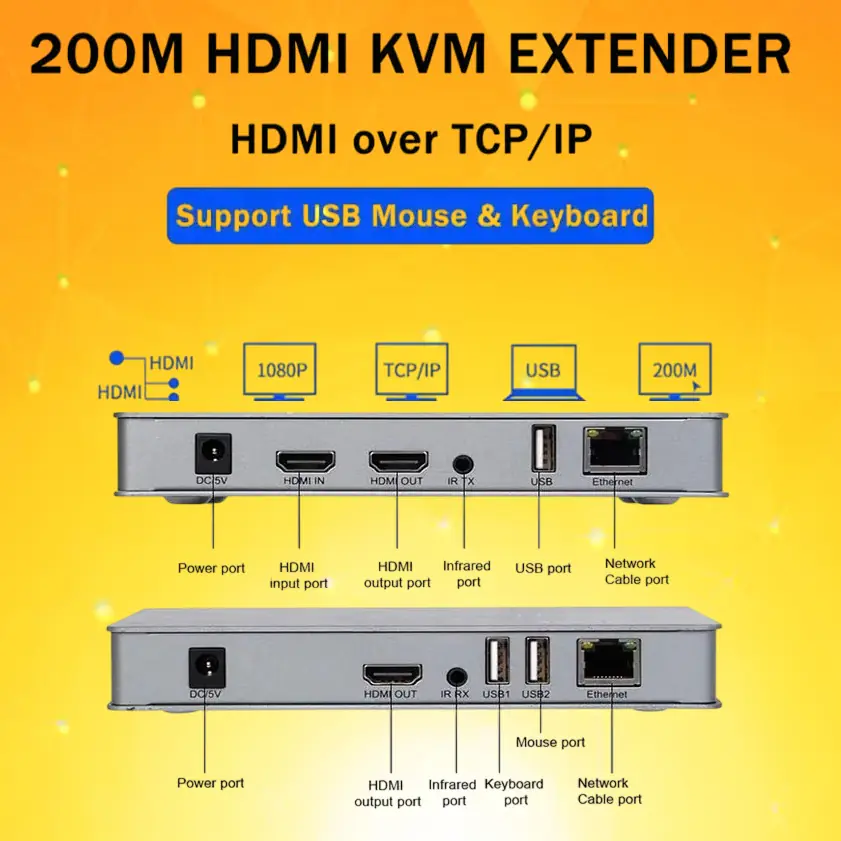 200M HDMI KVM Extender Over Ethernet Cat5e/Cat6/Cat7 Cable, Supports 1080P, 4K, 3D, USB Keyboard & Mouse, DTS Audio, Dolby TrueHD, Plug-and-Play, Ideal for Home Theater, Video-Conferences