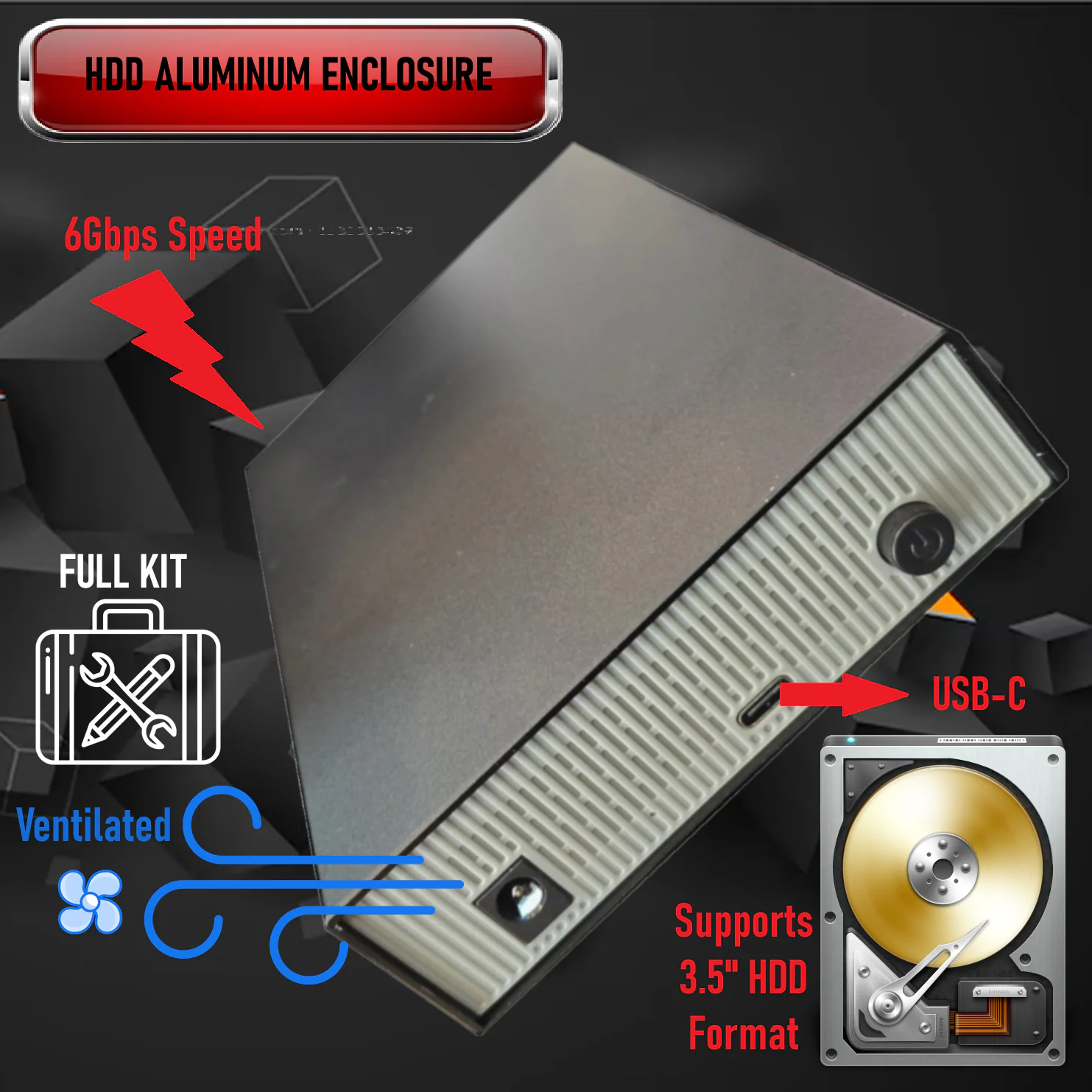 3.5 Inch SATA HDD Enclosure With USB 3.1 Gen 2 Type-C Port, Aluminum Build , 6Gbps Speed, Ventilated Drawer, Screw Mount, USB C to A Cable | Black-Grey