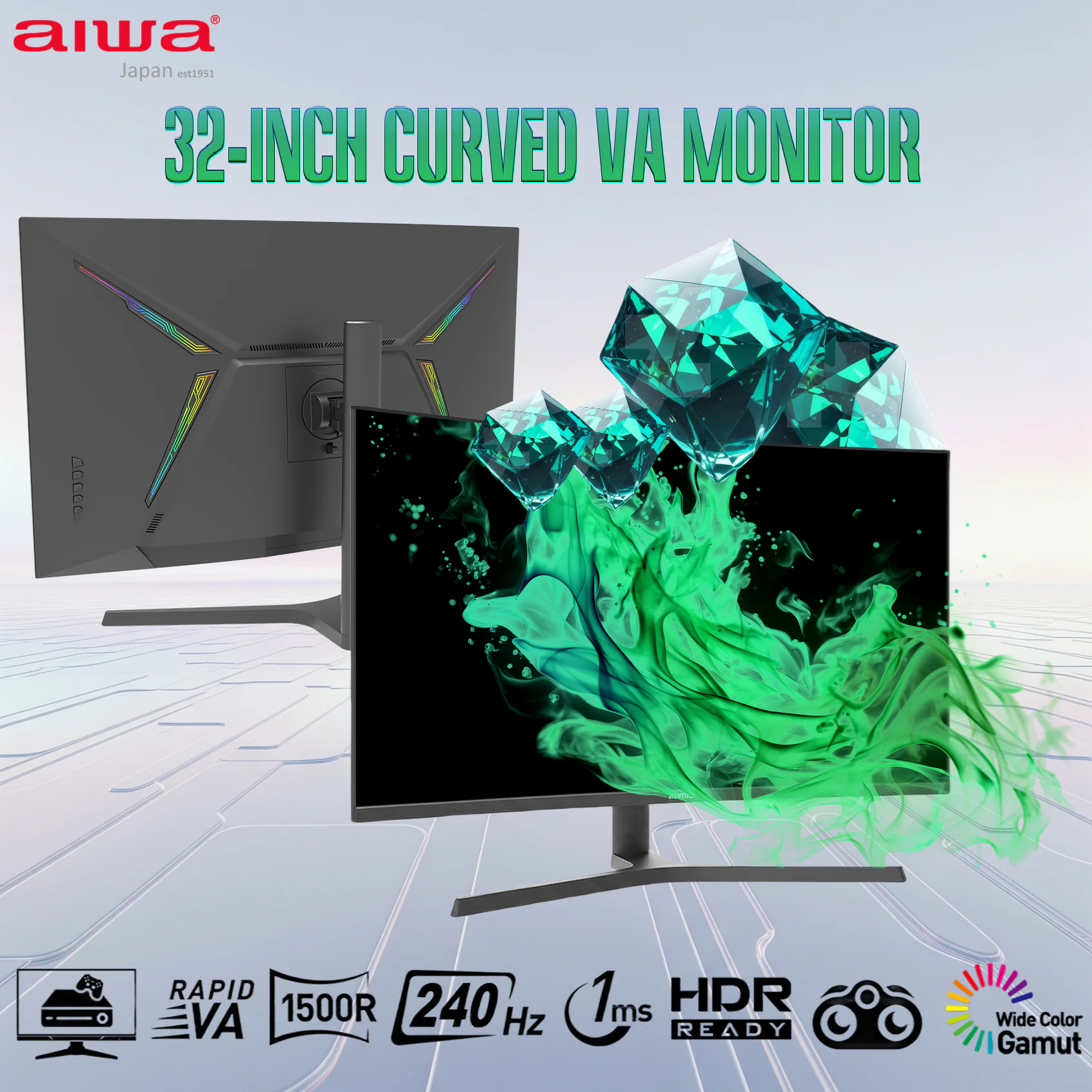 Aiwa 32-Inch Curved VA Monitor, FHD 1920×1080, 240Hz Refresh Rate, 1ms Response, HDR Ready, Flicker-Free Eye-Care, HDMI/DP/USB-A/Audio, Ultra-Narrow Frame, Black | MD320G-Y