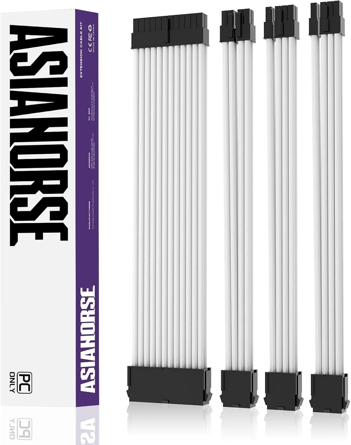 ASIAHORSE 18AWG White PSU Cable Extension Kit – 4 Pack (24-Pin ATX, 4+4 Pin EPS, 2x PCI-E 6+2) Braided Sleeved, Soft Nylon, Cable Combs, Universal Compatibility