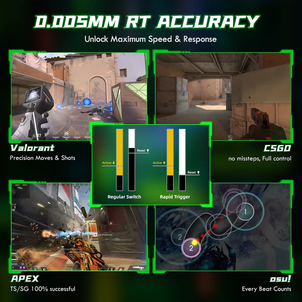 - 0.005mm Rapid Trigger Precision : Industry-leading 0.005mm RT sensing accuracy creates a true zero dead zone, enabling pixel-perfect stops in FPS games and ultra-clean ability execution in MOBAs.
