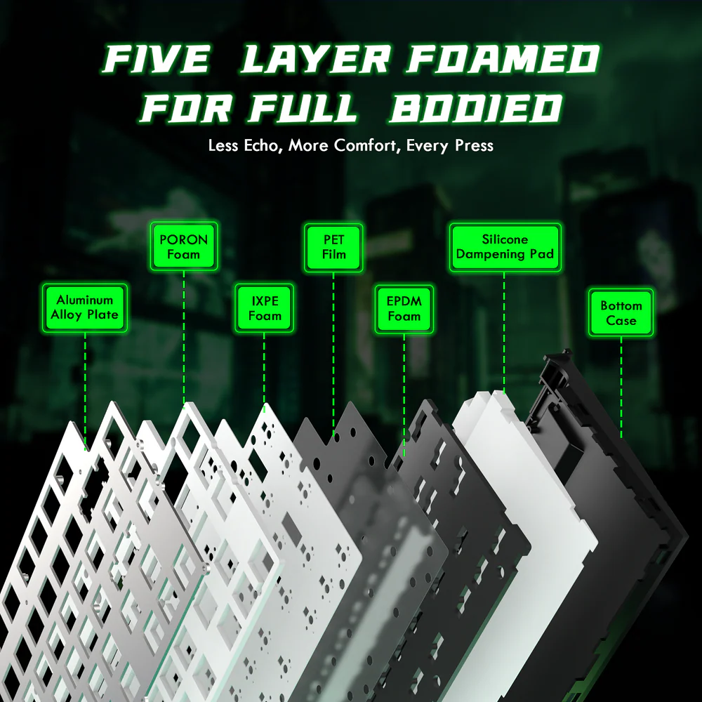 - 5-Layer Sound-Optimizing Structure : A premium internal stack of PE Foam, IXPE, PET, Foam, and Silicone absorbs metallic ping and rattle, delivering a clean, creamy “thock” with every keystroke.