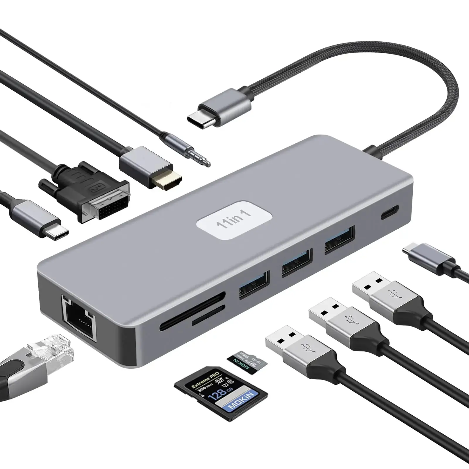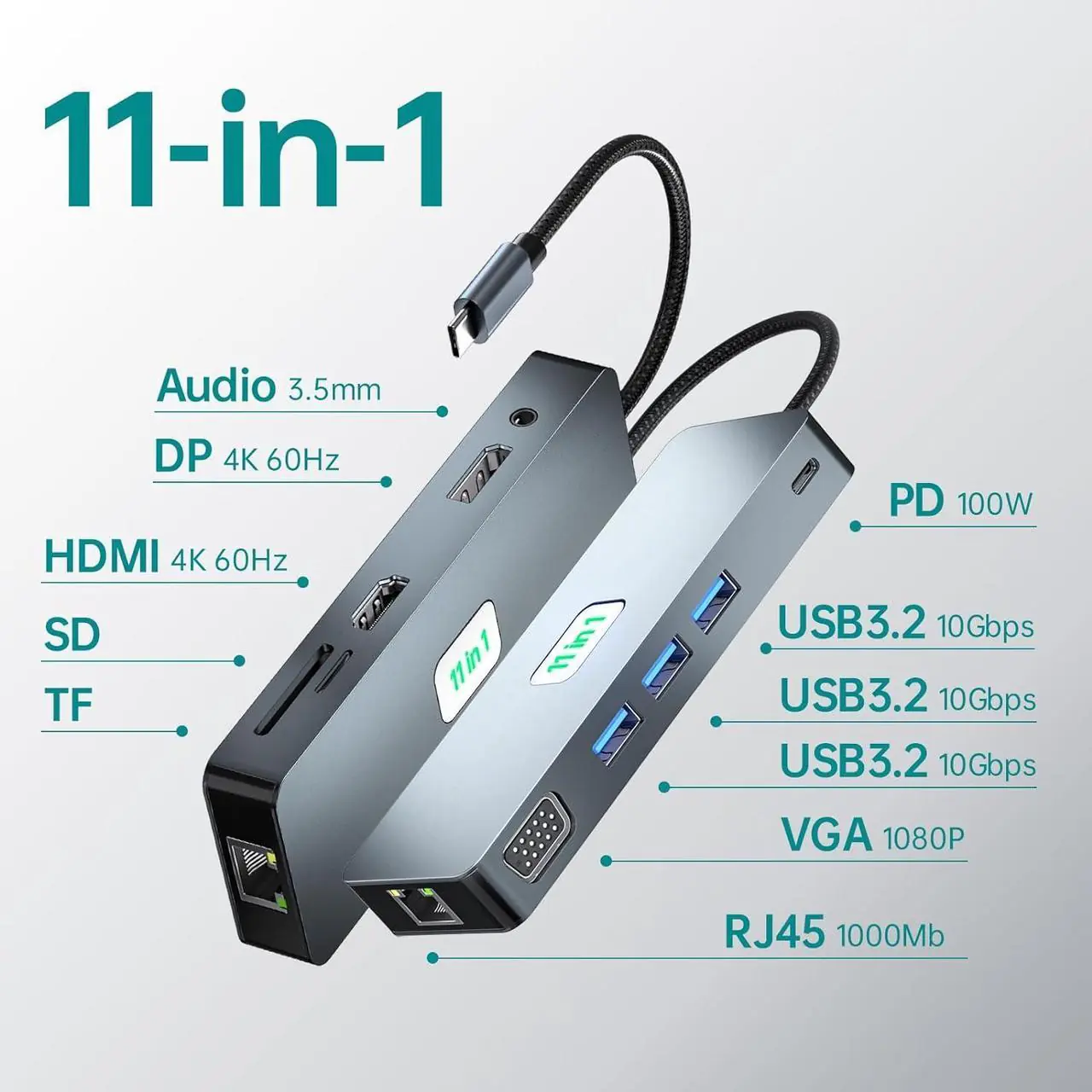 - 11-in-1 USB C Docking Station – Expands a single USB-C port into USB 3.2 Gen2 (10Gbps), HDMI (4K@60Hz), DisplayPort (4K@60Hz), VGA (1080P@60Hz), 100W PD, Ethernet (1000M), SD/TF Card Reader, and 3.5mm Audio.