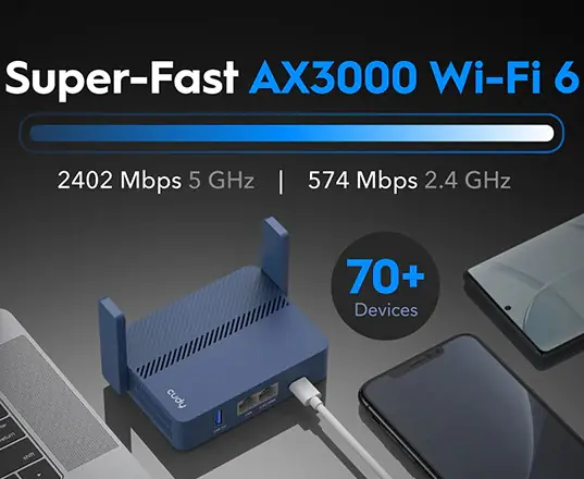 - Next-Gen AX3000 Wi-Fi 6 Speed: Enjoy ultra-fast dual-band speeds up to 2402 Mbps (5GHz) + 574 Mbps (2.4GHz) with support for 1024-QAM and 160 MHz channel width.