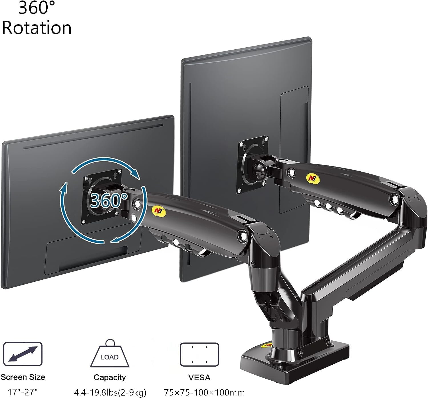- Your two screens will have 360° rotation, tilt angle +85° to -30°, swivel ±90° Upright up to 10″(260mm) and max extension is 20.8″(530mm).