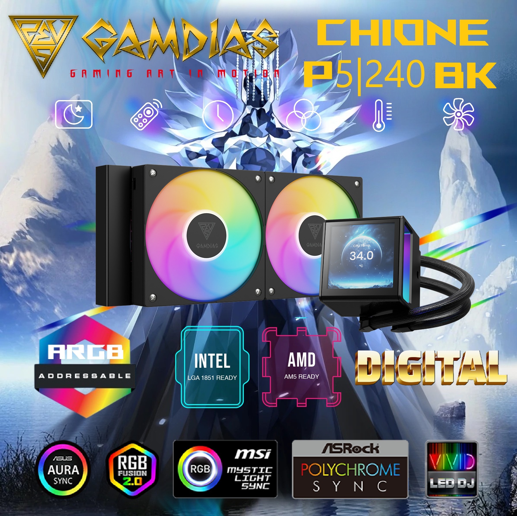GAMDIAS CHIONE P5-240 AIO ARGB Liquid Cooler – 3.4” IPS LCD, 240mm Radiator, ARGB PWM Fans, Rotatable Display, Upgraded Cooling System, Universal Compatibility, Hidden Cable Routing, Motherboard Sync | BLACK