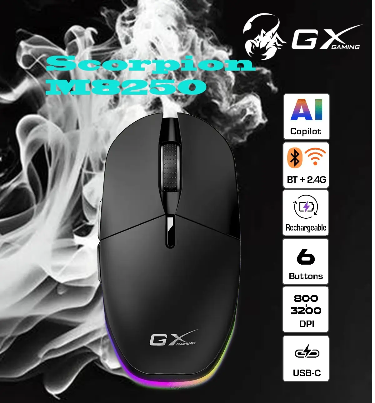 Genius Scorpion M8250 Wireless 2.4GH Bluetooth Rechargeable Gaming Mouse with LED, Dual Mode (Bluetooth 5.0 & 2.4GHz) , RGB Backlighting, Adjustable DPI (800-3200), AI Copilot Key, USB-C Charging, for Gaming and Work | BLACK