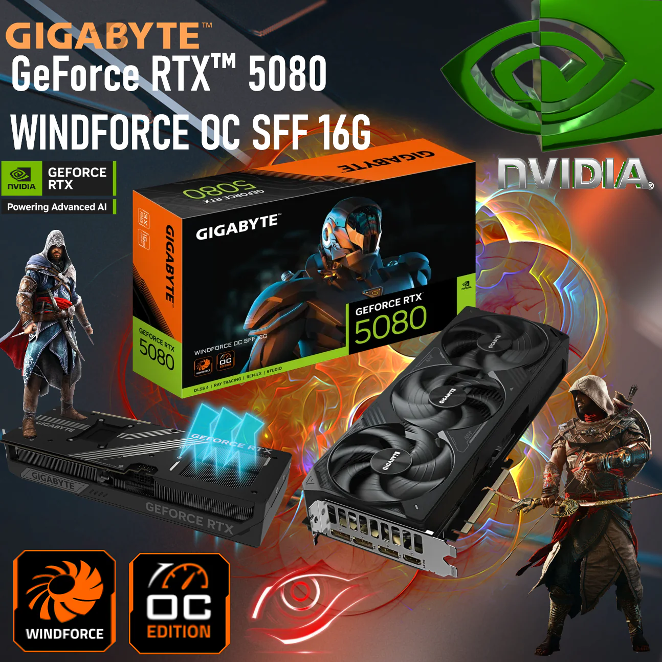 GIGABYTE GeForce RTX 5080 WINDFORCE OC SFF 16G Graphics Card With 16GB GDDR7, DLSS 4, 2670MHz Core, Dual BIOS, Hawk Fans, Vapor Chamber, Reinforced Build, PCIe 5.0 | BLACK