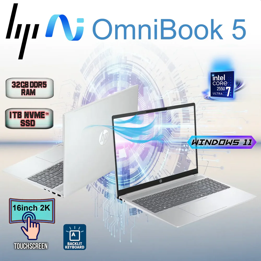 HP OmniBook 5 Intel® Core Ultra 7 255U | 32GB DDR5x RAM ; 1 TB NVMe SSD | 16 inch 2K IPS Touch Screen Display | Backlit Keyboard | Windows 11 | Glacier silver 16-af1173cl