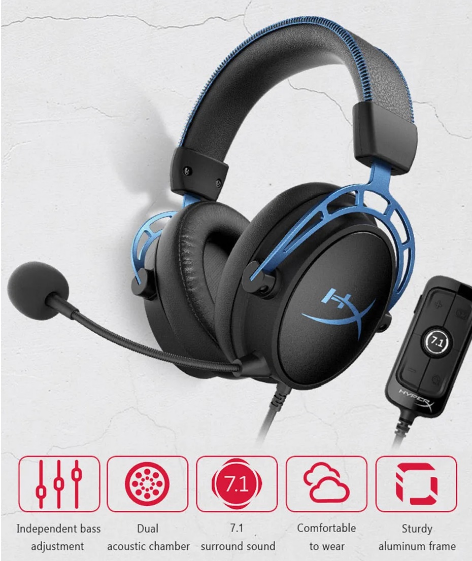 HyperX Cloud Alpha S – PC Gaming Headset, 7.1 Surround Sound, Adjustable Bass, Dual Chamber Drivers, Chat Mixer, Breathable Leatherette, Memory Foam, and Noise Cancelling Microphone – Blue – OPEN BOX