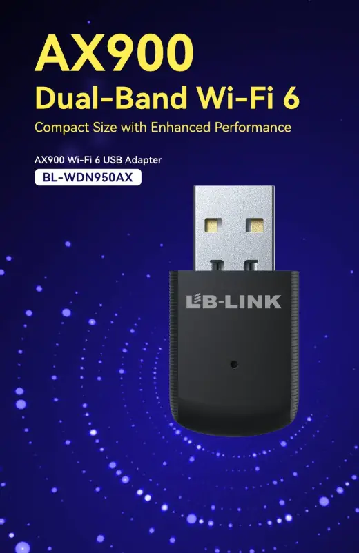 LB-Link 950AX Mini USB Dongle WiFi 6 AX900 Adapter, Dual-Band 2.4GHz & 5GHz, 900Mbps Speed, MU-MIMO, WEP/WPA/WPA2 Security, Driver-Free for Windows | WDN950AX