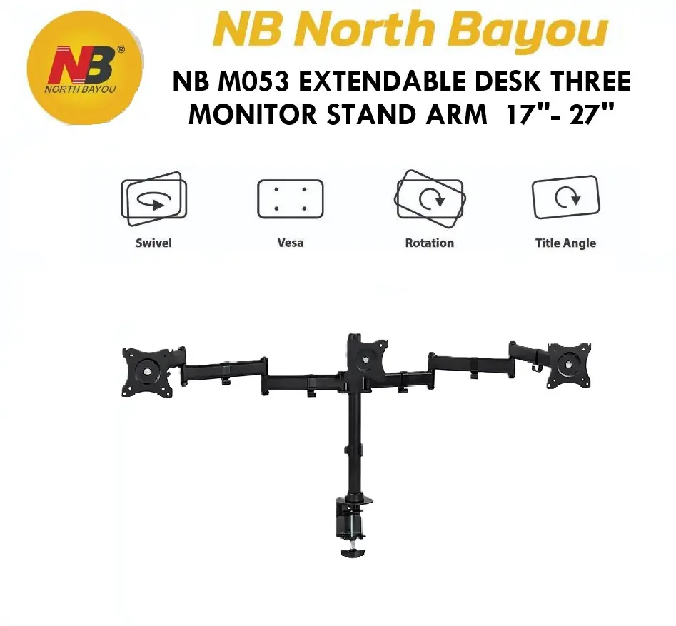 NB M053 Triple Monitor Desk Mount | Fits 17”-27” | 360° Rotation | 3 Arms | VESA 75×75 / 100×100 | Heavy Base | Tilt | Portrait Mode | Foldable Arm