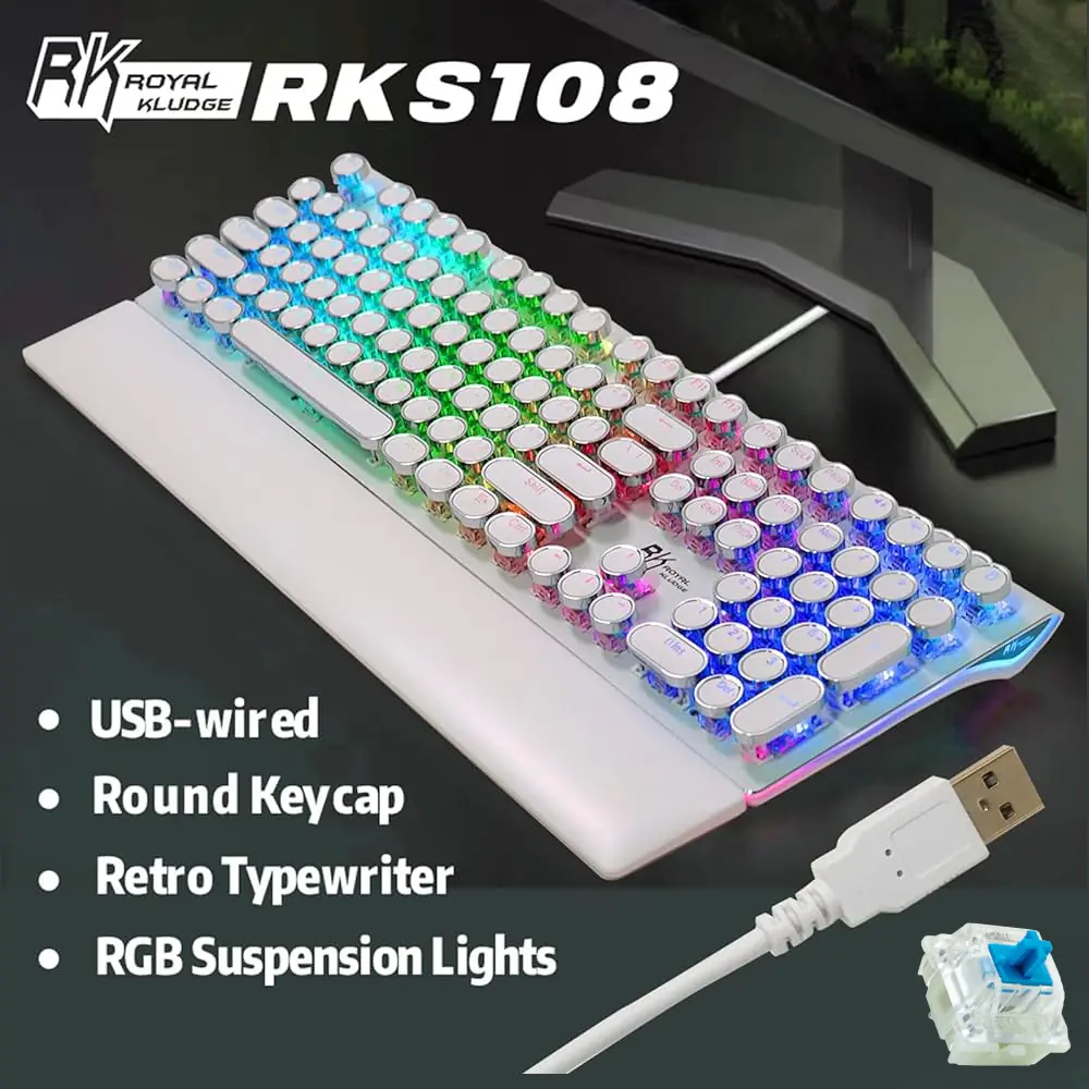 Royal Kludge 108-Key RGB Mechanical Keyboard | Wired | Steampunk Retro Typewriter Style | Detachable Wrist Rest | Anti-Ghosting | Metal Panel | PC/Mac/Linux | Blue Switch