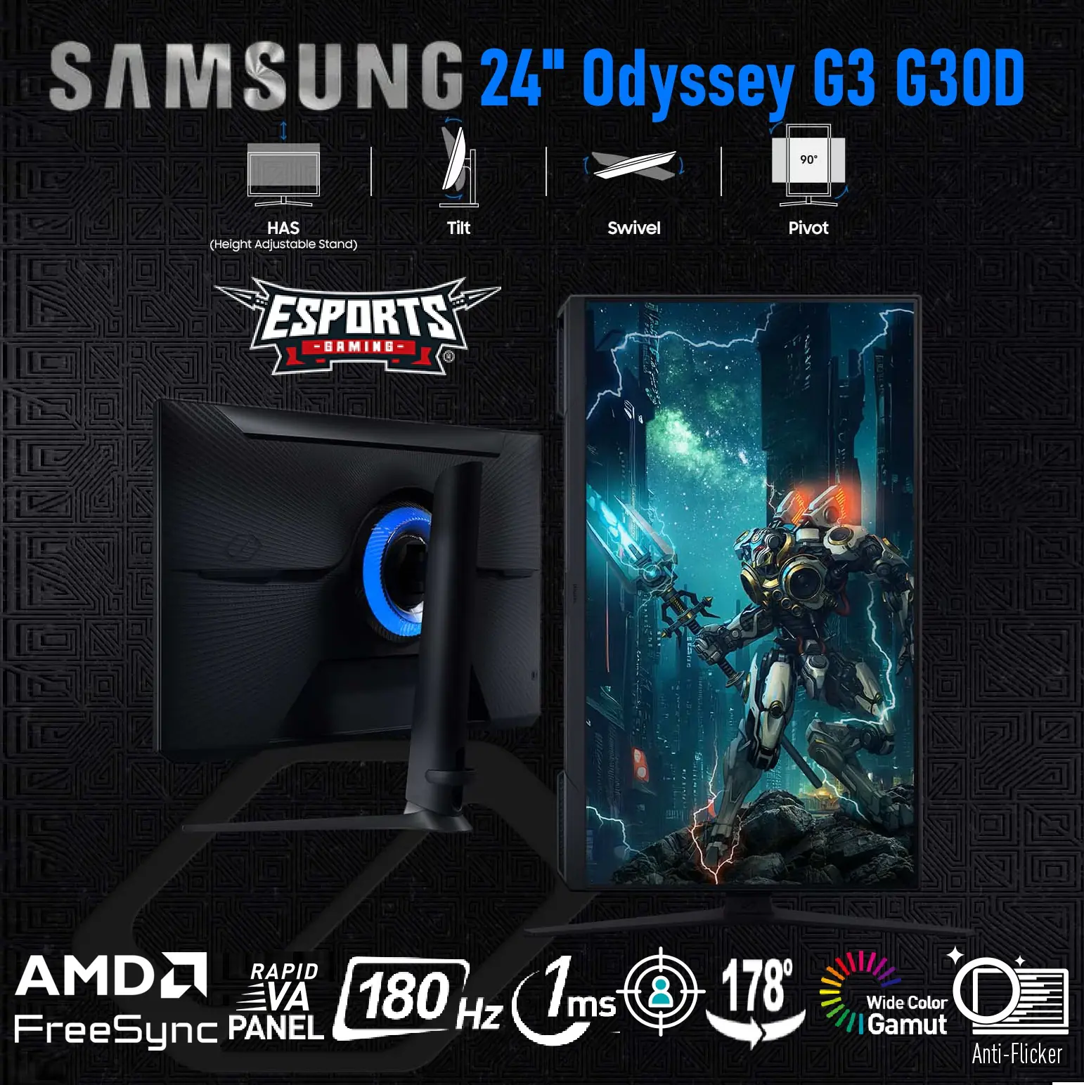 Samsung 24 inches Odyssey G3 G30D FHD 180Hz VA Gaming Monitor – Ultra-Fast 1ms, AMD FreeSync , HDR10, Ultra-Adjustable Stand ” Height, Tilt, Swivel, Pivot ” , 3-Sided Borderless Design , Virtual Aim Point | BLACK