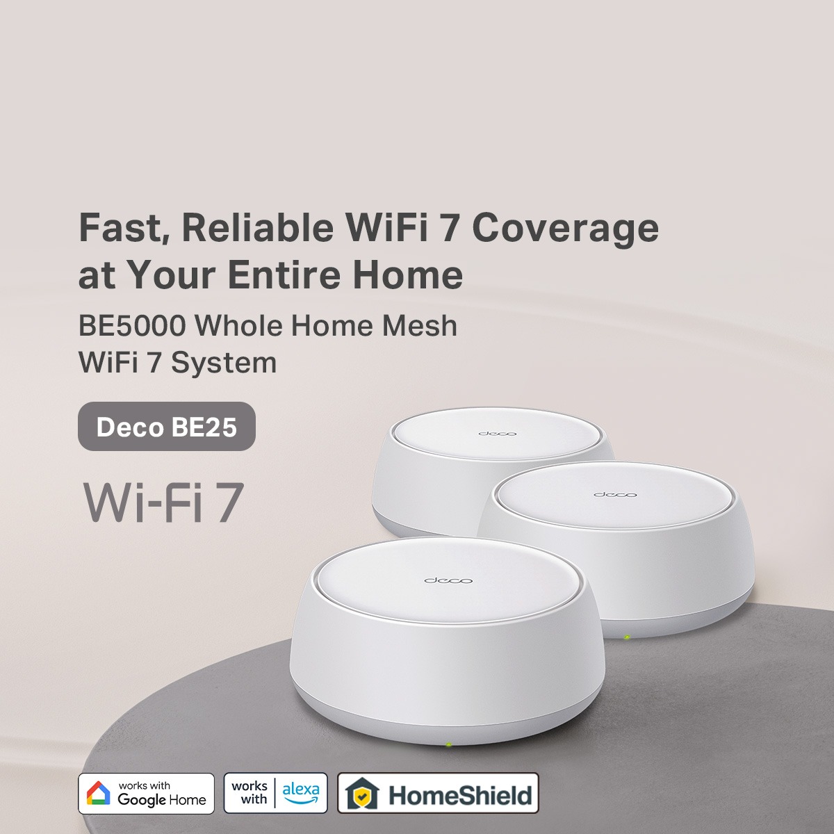 TP-Link Deco BE25 BE3600 WiFi 7 Mesh System (3-Pack) – 3.6 Gbps Dual-Band, 2× 2.5G Ports, MLO, AI Roaming, HomeShield Security, 4K-QAM, Seamless Coverage for 150+ Devices