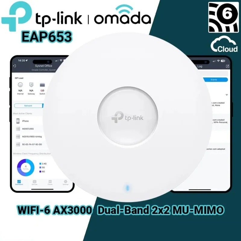 Expert Features AX3000 Dual-Band WiFi 6 Performance: The TP-Link EAP653 delivers a combined 2976 Mbps WiFi 6 speed, featuring 574 Mbps on 2.4 GHz and 2402 Mbps on 5 GHz, providing more than twice the throughput of previous-generation WiFi 5 access points. High-Efficiency WiFi 6 Technology: Designed for dense environments, WiFi 6 enables more clients to connect simultaneously with reduced latency, enhanced efficiency, and improved overall network responsiveness. Omada SDN Centralized Cloud Management: Integrates seamlessly into the Omada Software Defined Networking platform, offering cloud or local management through the Omada app, hardware controller, or software controller. Provides network-wide monitoring, configuration, and remote control. HE160 for Higher Throughput: Supports 160 MHz channel width, doubling data rates per stream for significantly faster peak speeds—ideal for high-bandwidth applications such as HD streaming, cloud access, and large file transfers. Seamless Fast Roaming: Users move between APs without dropping calls, video conferences, or streaming sessions as the EAP653 intelligently and automatically hands off the client to the strongest signal. Omada Mesh Support: Enables wireless mesh backhaul between access points, reducing wiring requirements and extending coverage into hard-to-cable zones. Includes self-organization and self-healing features for continuous connectivity. Auto Channel Selection & Power Adjustment: Reduces WiFi interference by automatically adjusting wireless channels and transmission power among multiple APs in the same network, optimizing performance. Slim and Modern Ceiling Design: With a sleek 160 mm × 33.6 mm housing, the EAP653 blends into modern commercial spaces such as offices, hotels, classrooms, and meeting rooms. PoE+ Powering Flexibility: Supports 802.3at PoE+ and optional DC powering (adapter sold separately) for easy placement and ceiling/wall mounting without running extra cables. Business-Grade Security: Offers robust features such as WPA3, captive portal with voucher/SMS/Facebook login, 16 SSIDs, band steering, load balancing, and airtime fairness to maintain secure and efficient business networks. Expert Specs Category Specification Model TP-Link EAP653 Product Type AX3000 WiFi 6 Ceiling Mount Access Point Wireless Standard WiFi 6 (802.11ax) Speed 574 Mbps (2.4 GHz) + 2402 Mbps (5 GHz) Total Speed 2976 Mbps Channel Width 20/40/80/160 MHz (HE160) Antennas 2× internal high-gain antennas WiFi Features 1024-QAM, OFDMA, MU-MIMO, Beamforming Roaming Seamless Fast Roaming Network Management Omada SDN Cloud/Local, Omada App Mesh Support Yes, Omada Mesh Power 802.3at PoE+ / DC input (adapter not included) Dimensions Φ160 mm × 33.6 mm Mounting Ceiling, wall, junction box Security WPA3, captive portal, 16 SSIDs, 802.1X Performance Enhancements Band Steering, Load Balance, Airtime Fairness Use Cases Offices, hotels, malls, schools, meeting rooms Ports 1× Gigabit Ethernet (PoE+)